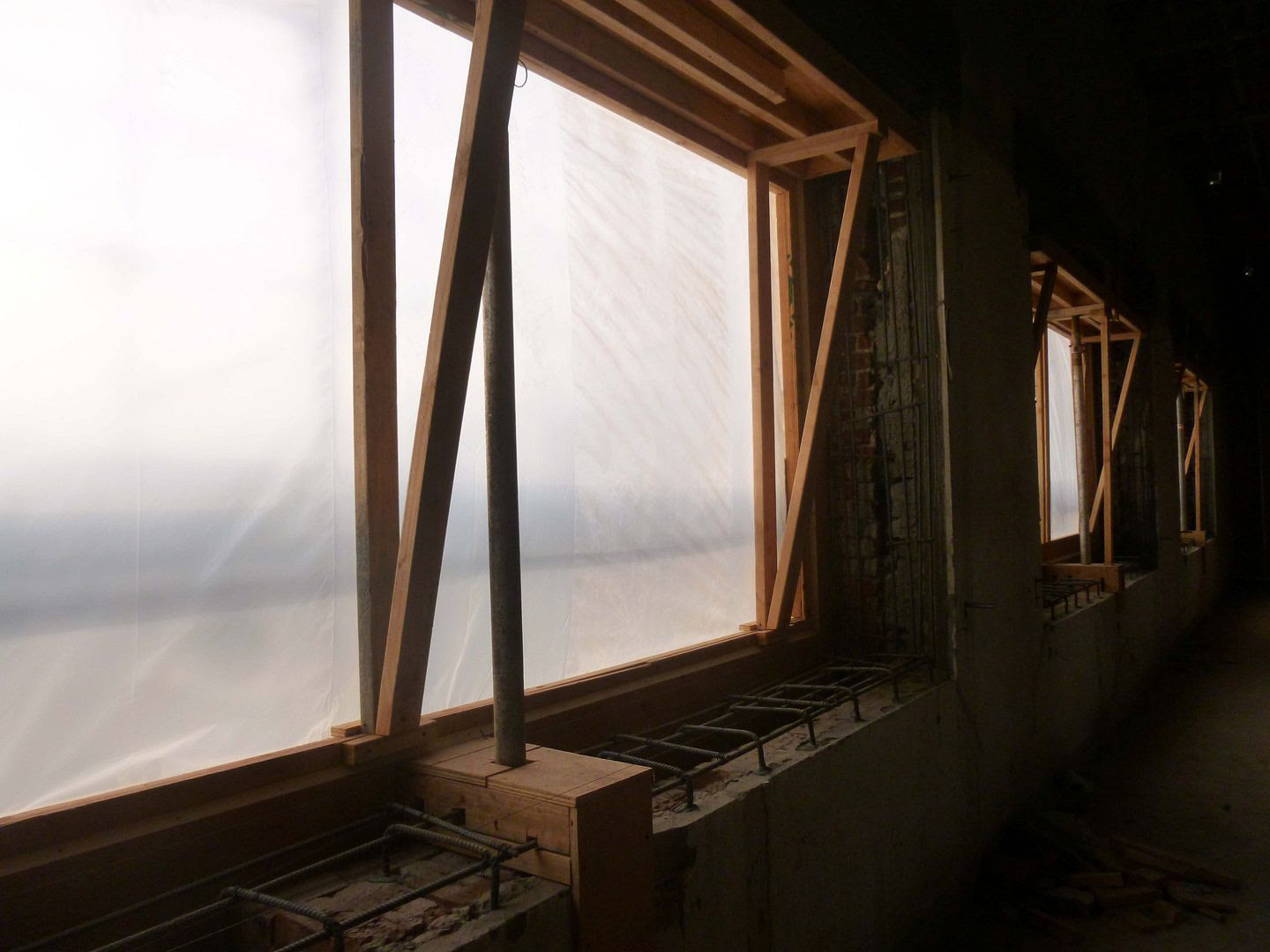 ...there's a building covered in scaffolding and tarps, which mask fragile windows and historic brickwork.