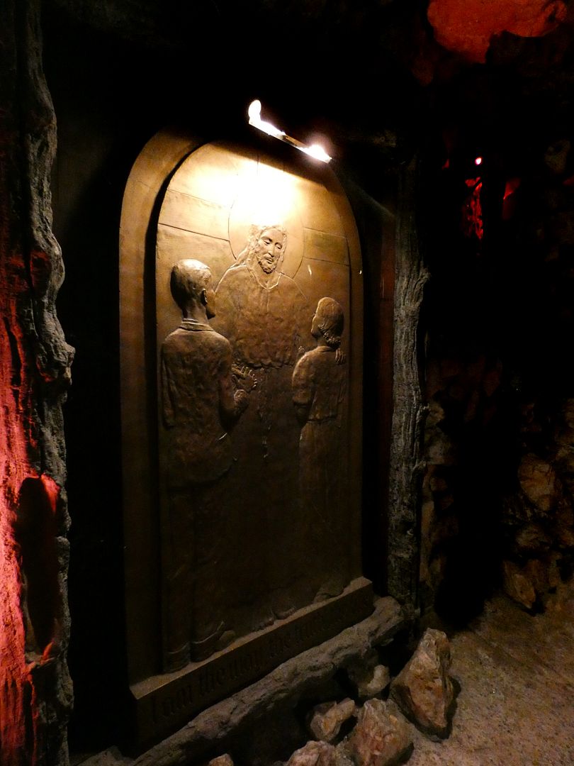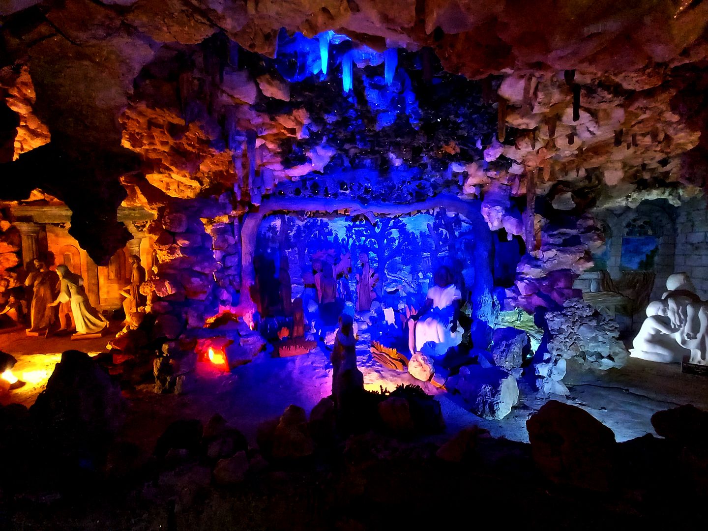 In the 1970s, a local young sculptor named David Day stepped in and created more figures for the grotto interior, like his "Sermon on the Mount" (1978), which is bathed in a deep blue hue.