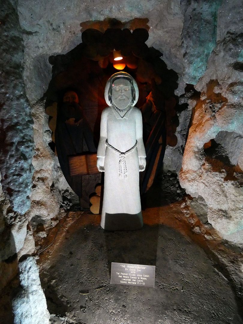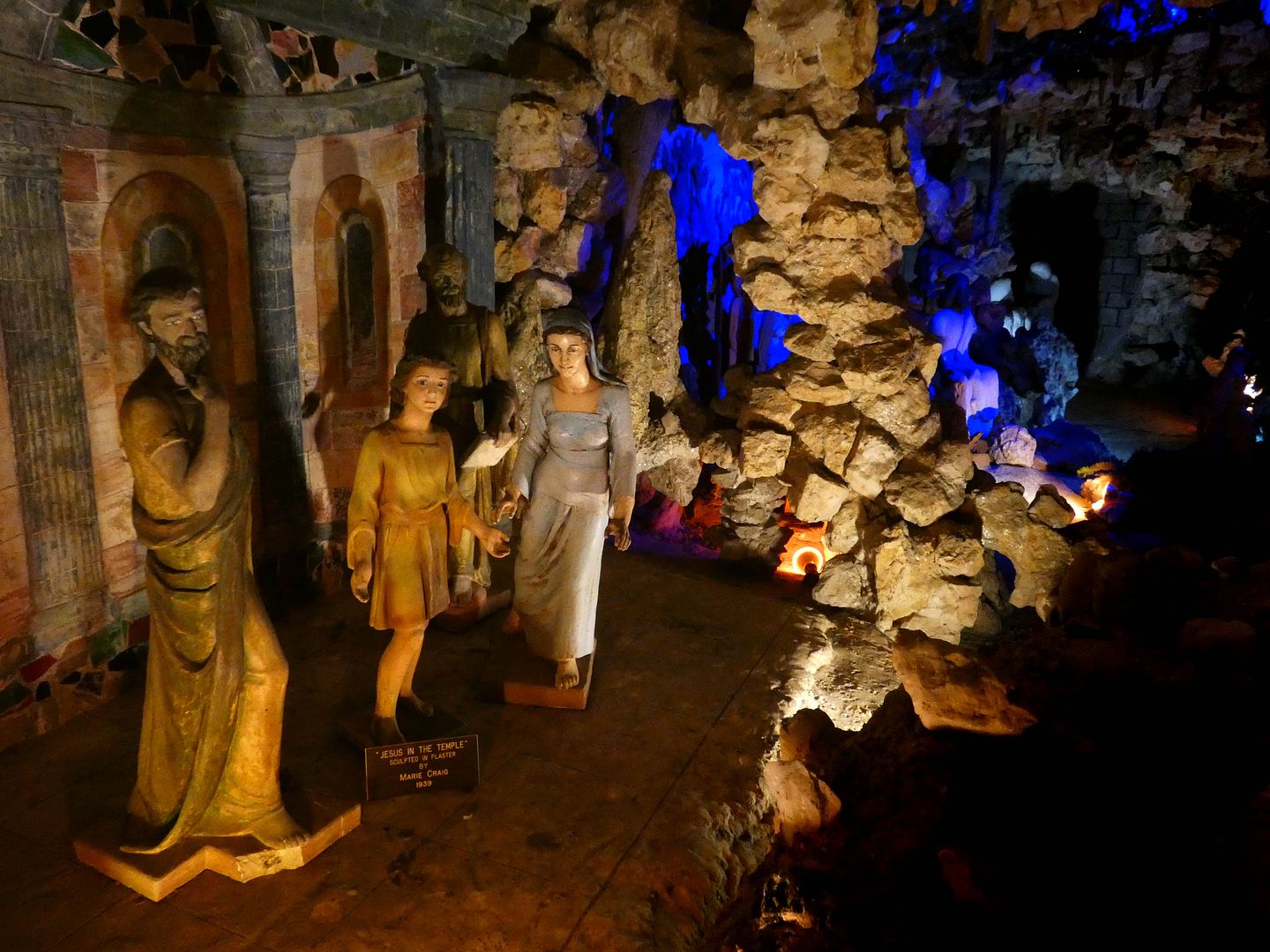 In the 1970s, a local young sculptor named David Day stepped in and created more figures for the grotto interior, like his "Sermon on the Mount" (1978), which is bathed in a deep blue hue.