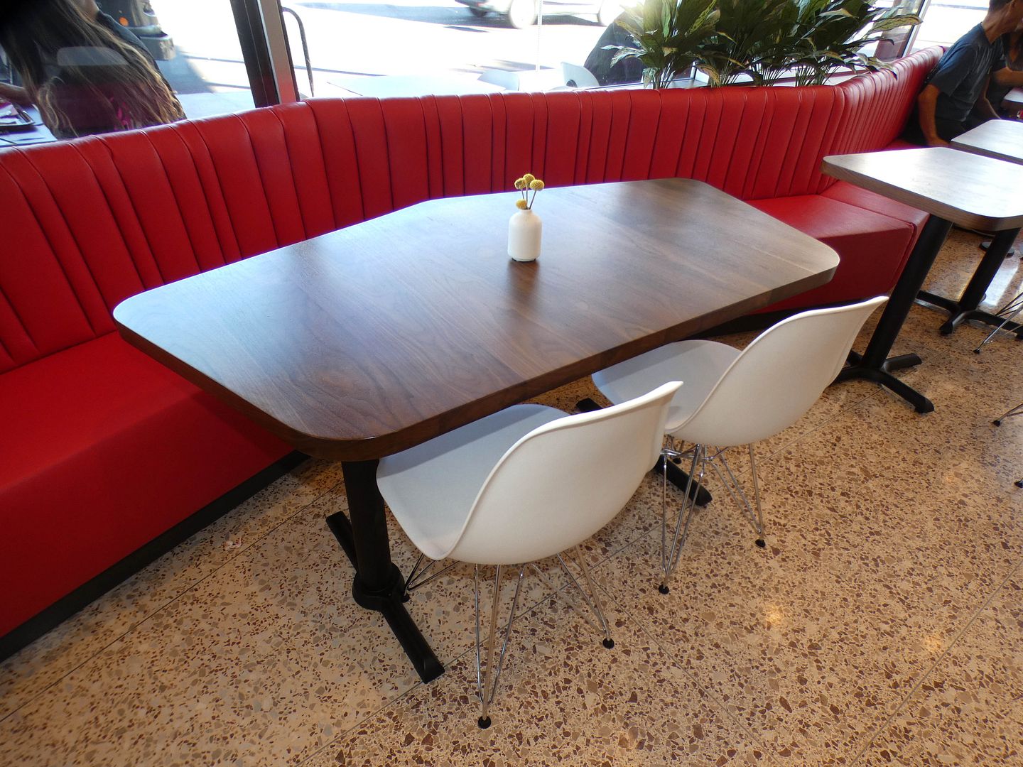 So are the Eames-style molded plastic chairs that line up against the red, folded plate banquette (or, what Hess describes as "sawtooth").