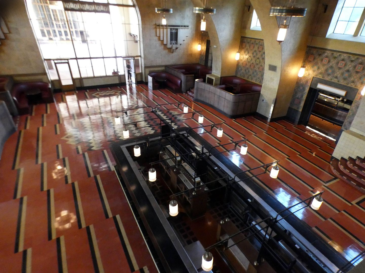 Looking down from the balcony, we could see the original restaurant bar in the center of the room, with that Navajo pattern in the tile floor. Everything is original, except the bar lights.