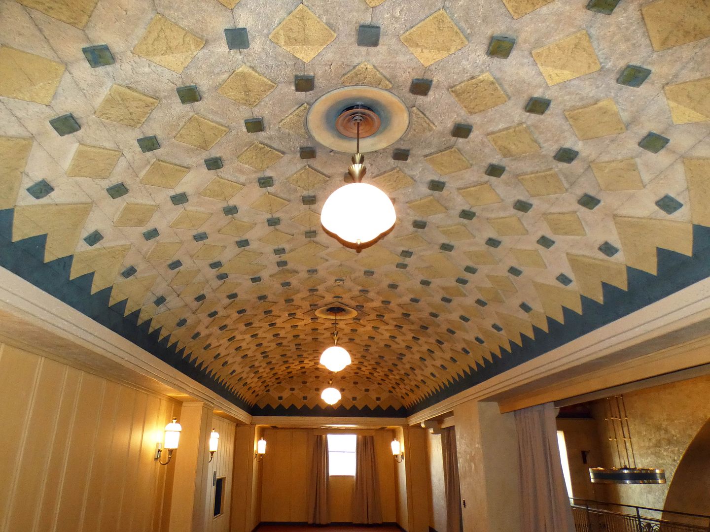 Looking down from the balcony, we could see the original restaurant bar in the center of the room, with that Navajo pattern in the tile floor. Everything is original, except the bar lights.