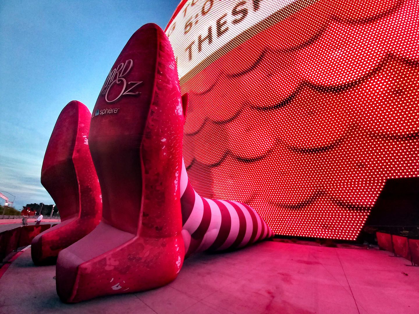 Red sequins provided the perfect backdrop for the Wicked Witch of the East's 50-foot-long legs and 22-foot-tall ruby slippers, sticking out from under the Sphere.