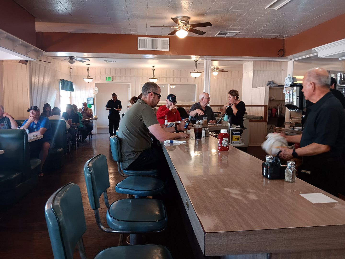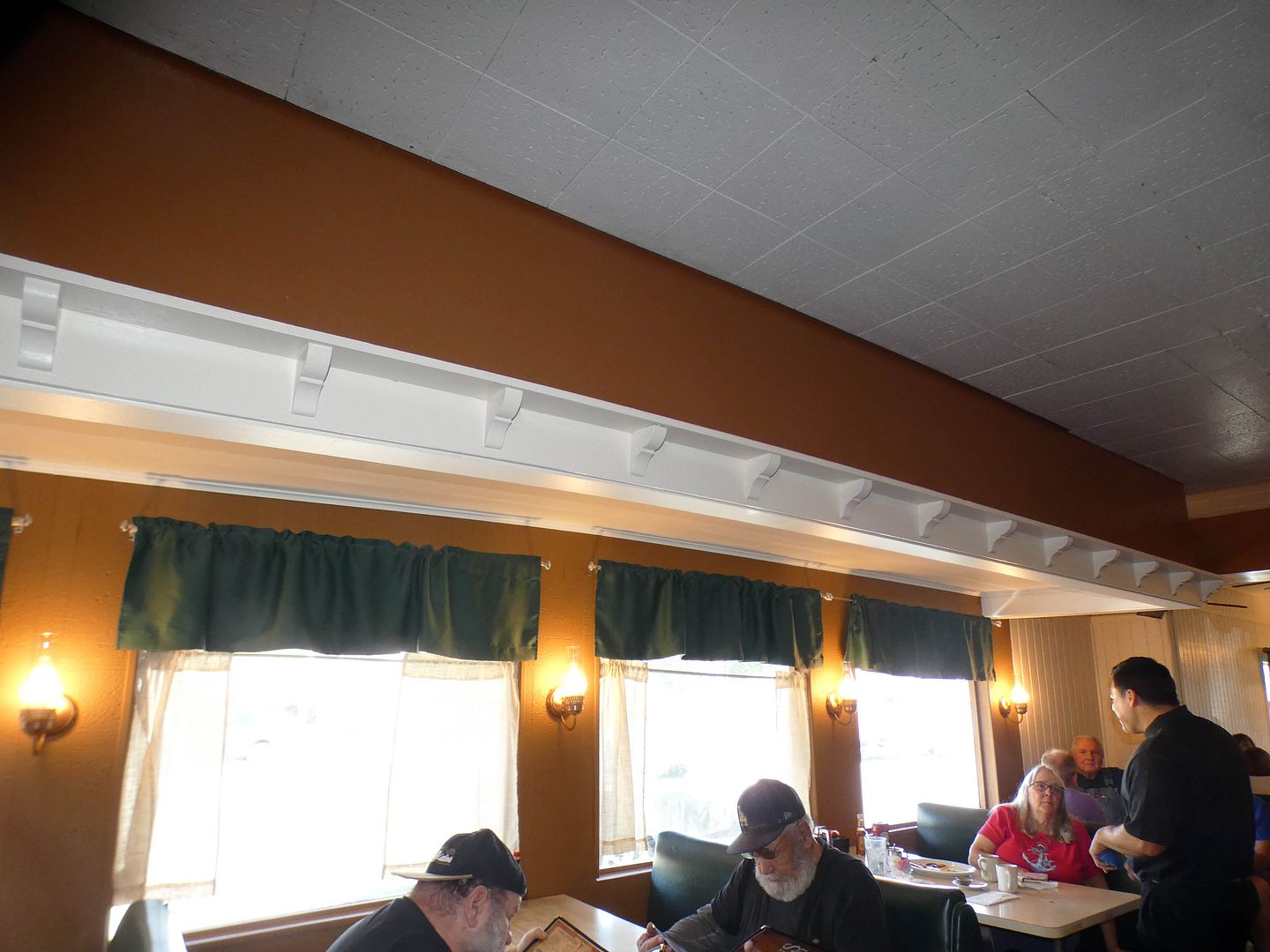 ...but the removal of the framed historic photos above the picture rail left the walls above the booths looking bare.