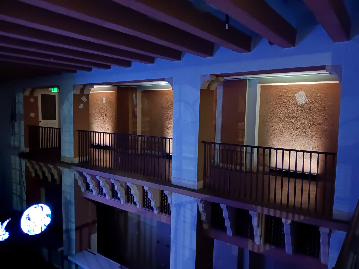 During the art show, one video projection lit up the room under the stage in hues of magenta and blue. (According to the Los Angeles Theatres blog, those stairs lead to the orchestra pit.)