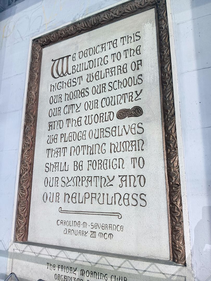 The building began in 1923 as the headquarters for The Friday Morning Club women's club, organized in 1891 by suffragette and abolitionist Caroline M. Severance (a.k.a. "Madame Severance") for civic reform and the betterment of society in "all things charity"—homes, schools, the city, the country, and the world.