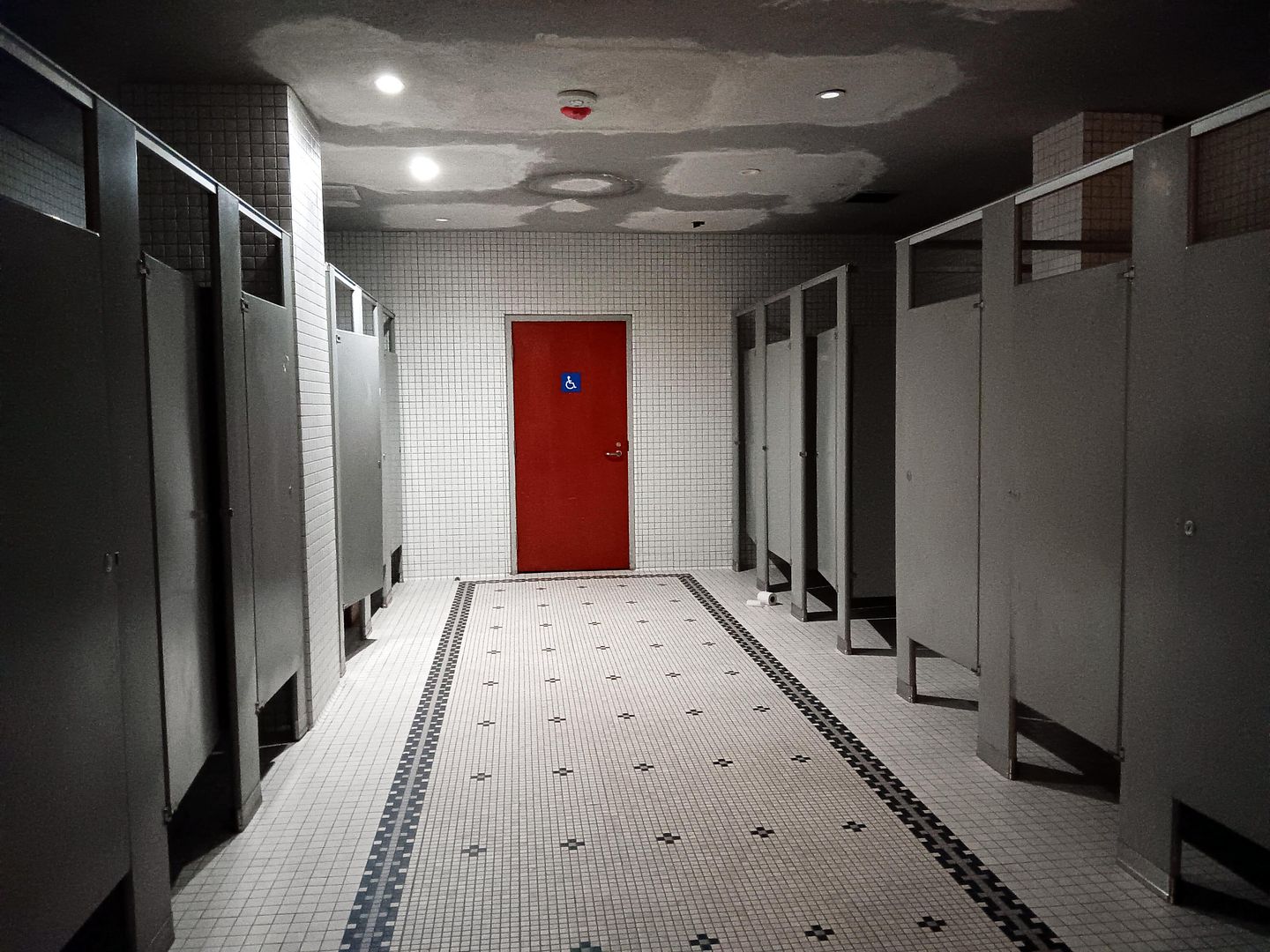 In the 1980s and '90s, there was actually a crazy nightlife scene happening at the Variety Arts Theatre, with too much "loud music" coming out of open windows and doors, the neighbors complained. Music from rock bands like Butthole Surfers, Stiff Little Fingers, Tin Machine (David Bowie's band), and Phish shattered eardrums; and dance club nights surely filled the ladies room (above) and men's room (below) with over-served partiers needing to empty their tanks.