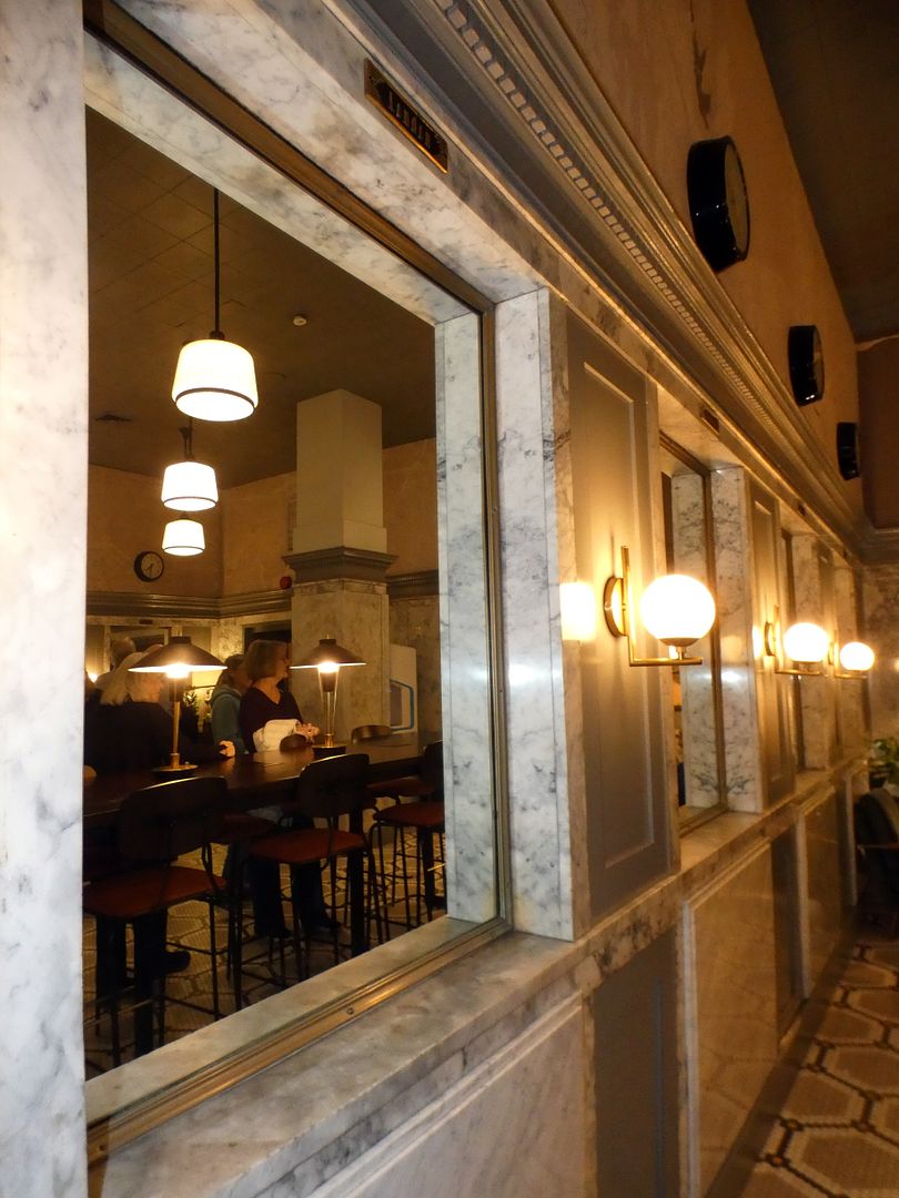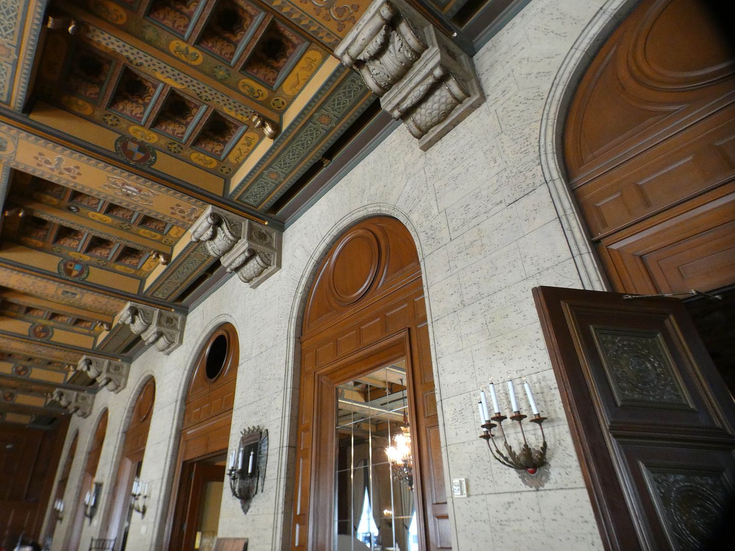 The bronze sconces on the travertine walls of the Main Dining Room are original, too...