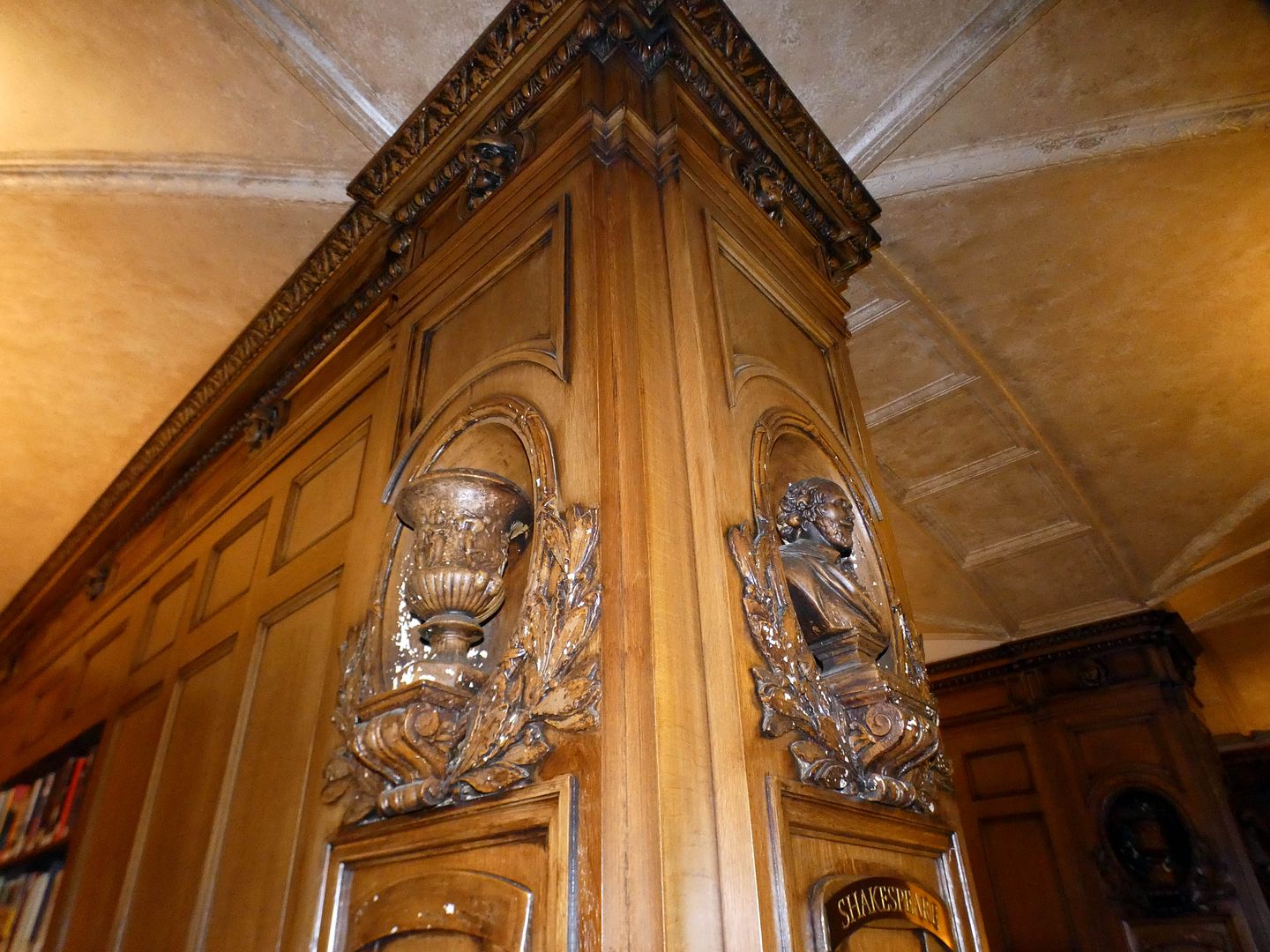 Hollywood set designers contributed intricate wood carvings of literary and philosophical figures like Shakespeare, Dante, Cicero, and Hippocrates.