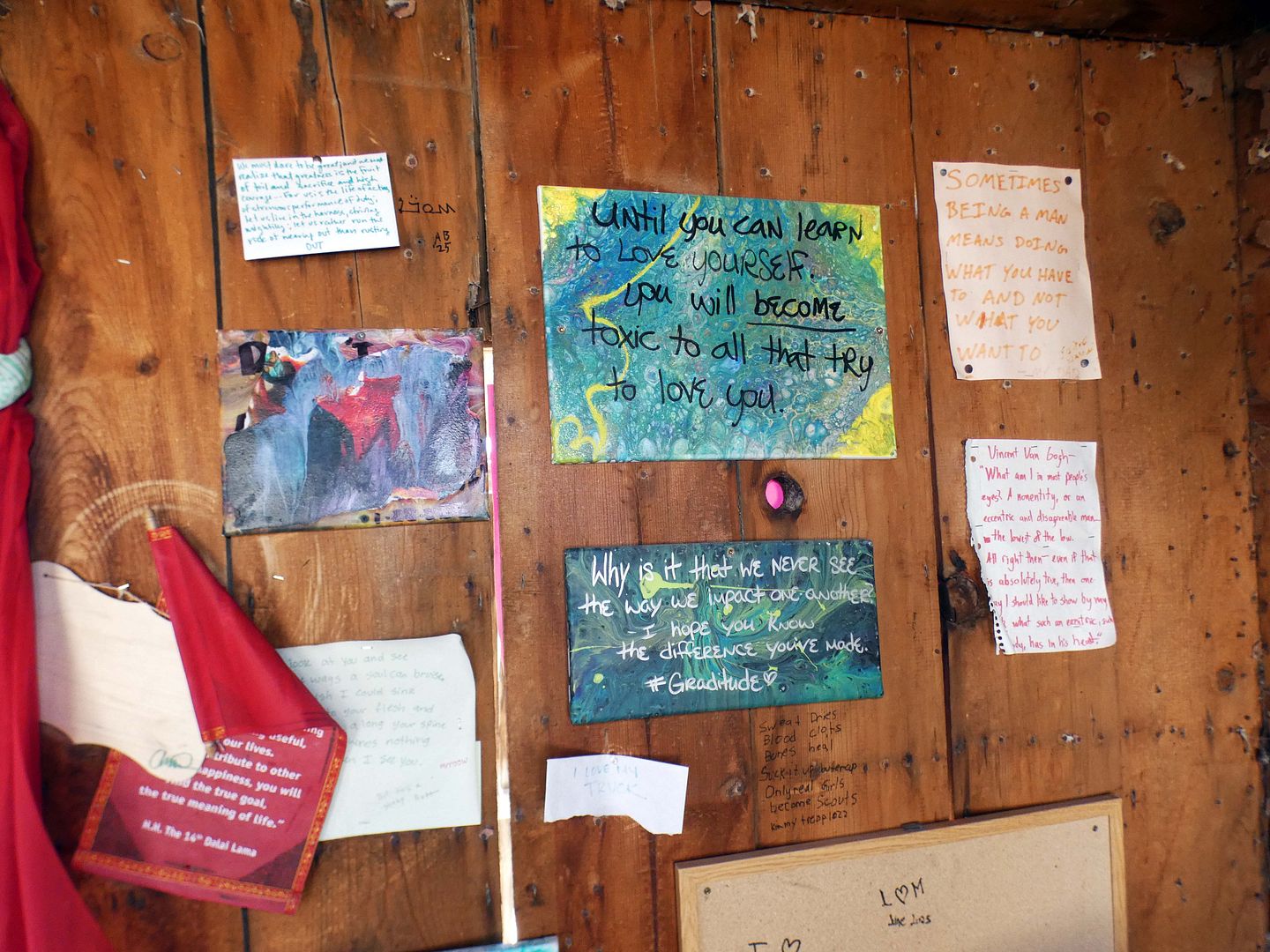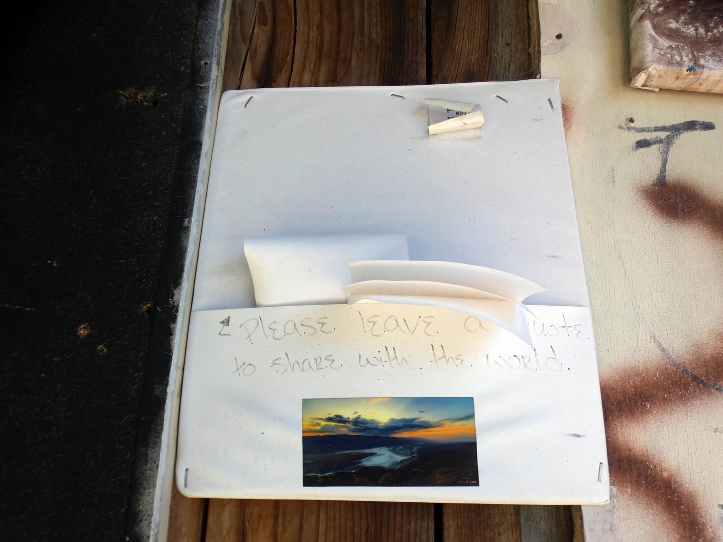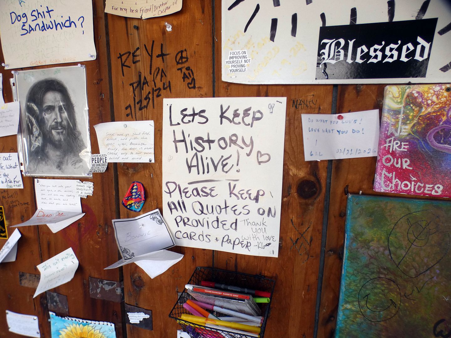 "Please leave a quote to share with the world," reads a makeshift display that offers blank slips of paper to visitors who want to leave their mark.