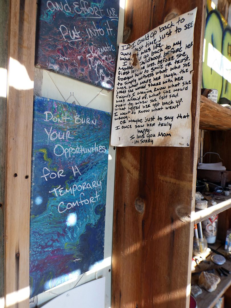 They appear scrawled across painted canvases, affixed more permanently to the walls than those that are simply tacked or taped. But as far as I can tell, the creator is anonymous.