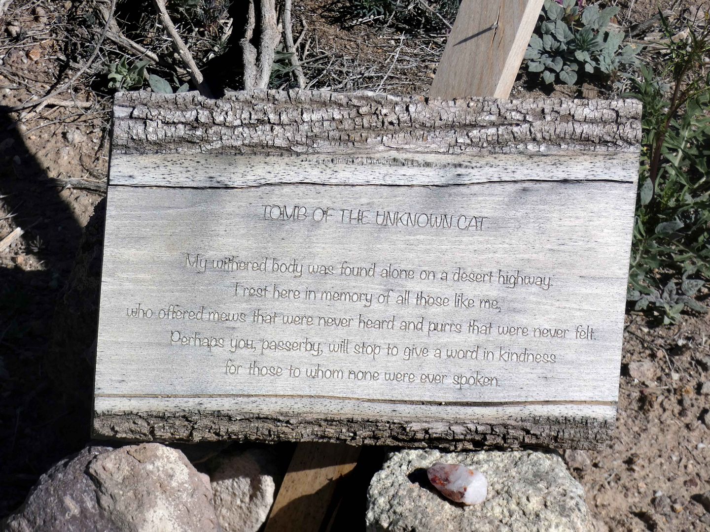 And a marker tells the story of an "Unknown Cat"—one who "offered mews that were never heard and purrs that were never felt." It's a generous tribute to a creature who'd been found alone on a desert highway, who in death might finally receive the words of kindness it never heard in life.
